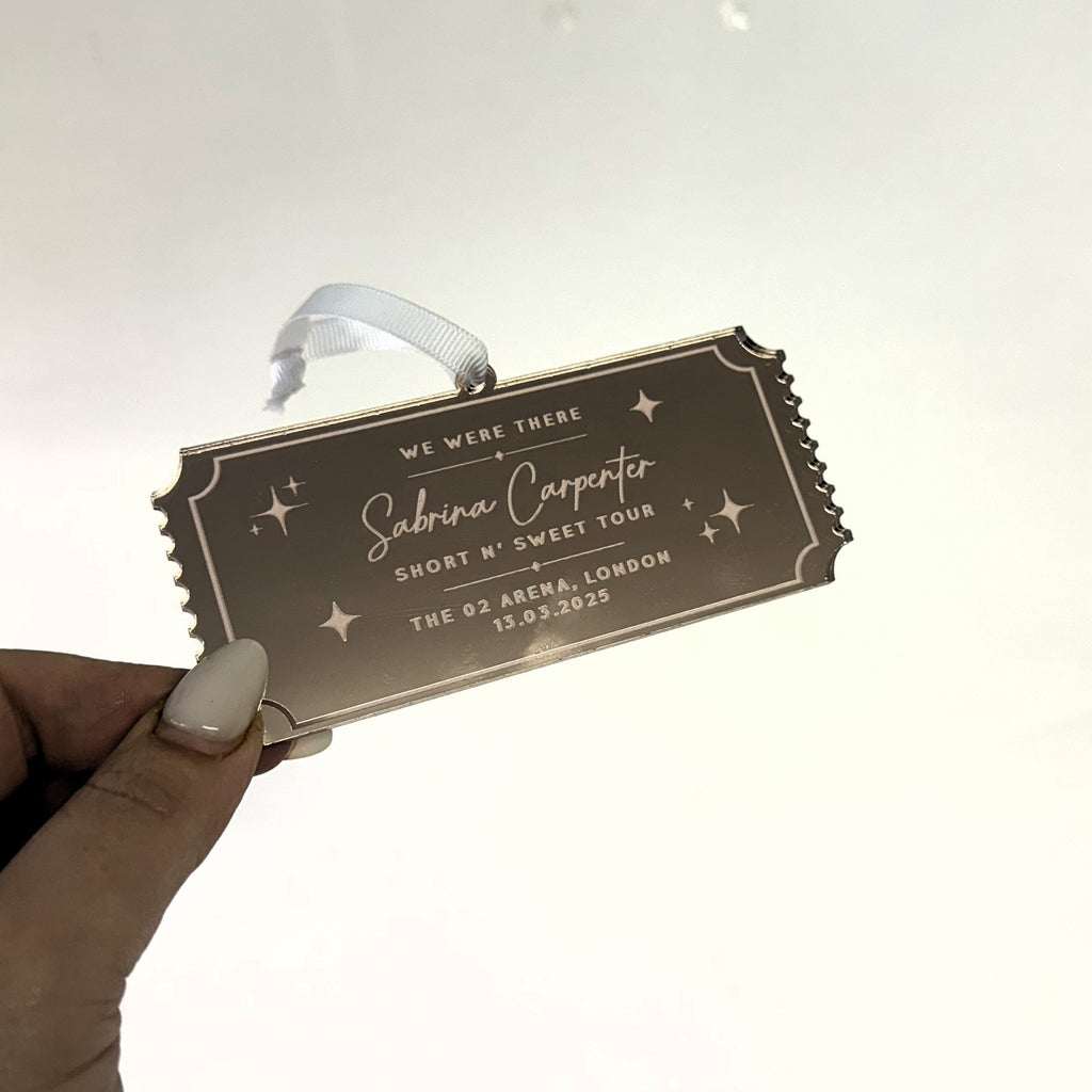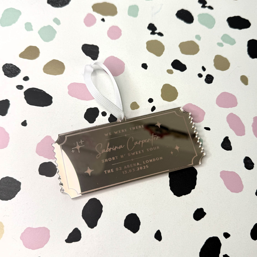This beautiful  rose gold mirrored acrylic concert-ticket bauble is perfect for commemorating an unforgettable night!