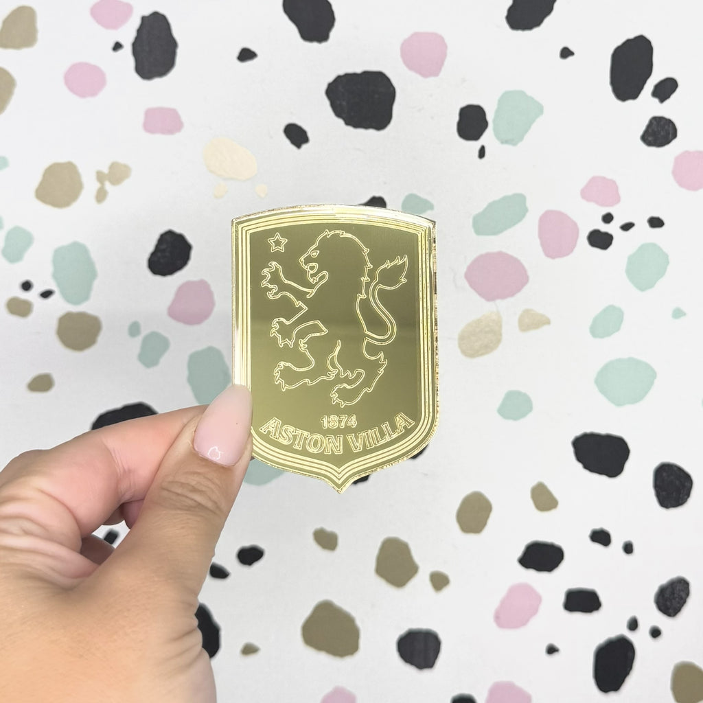 Aston Villa Football Club Cake Topper Charm, expertly crafted from stunning gold mirror acrylic. Featuring the iconic Aston Villa FC badge with detailed engraved outlines, this piece adds a sleek and stylish finish to any football fan’s cake or dessert setup.