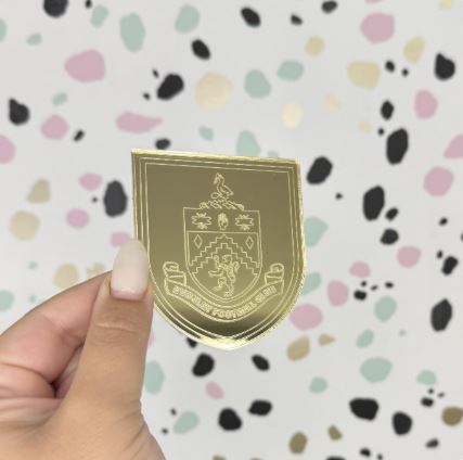 Burnley Football Club Cake Topper Charm, expertly crafted from stunning gold mirror acrylic. Featuring the Burnley FC badge with detailed engraved outlines, this piece adds a sleek and stylish finish to any football fan’s cake or dessert setup.