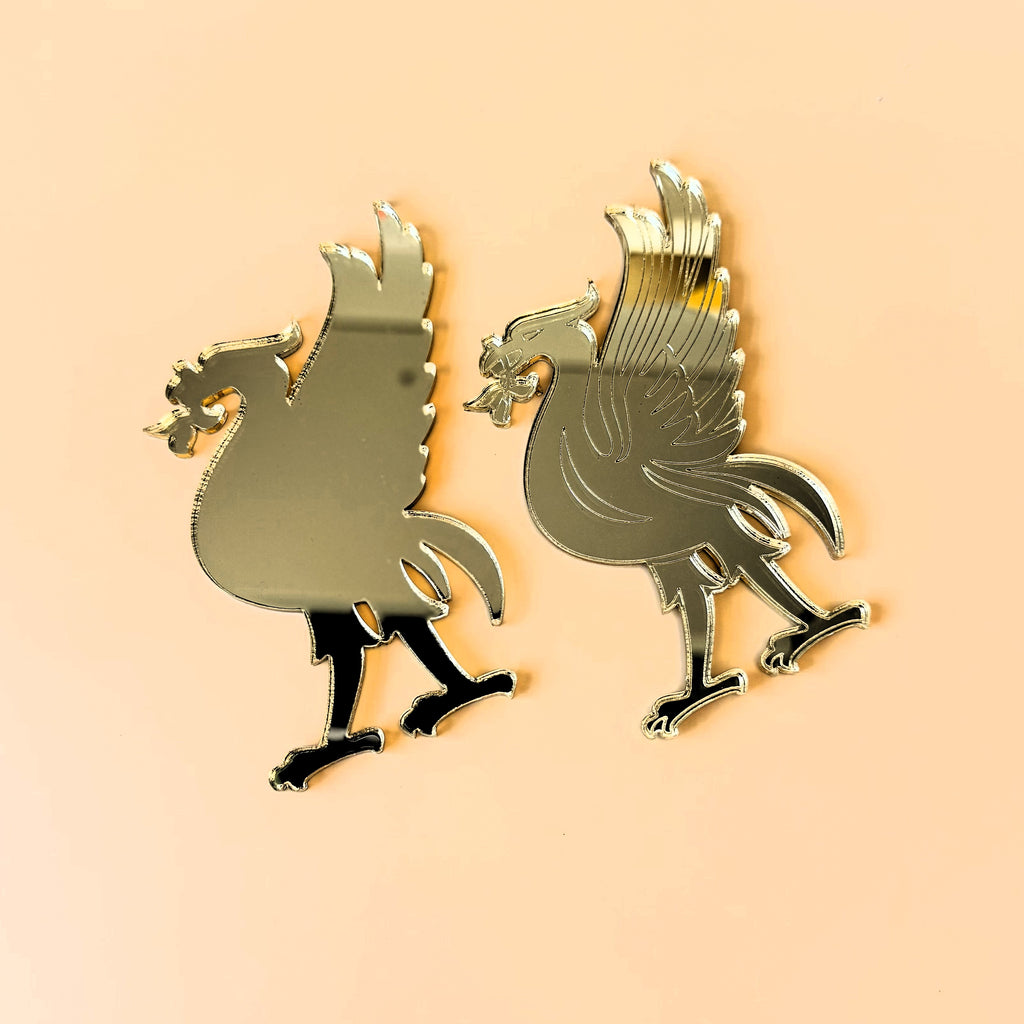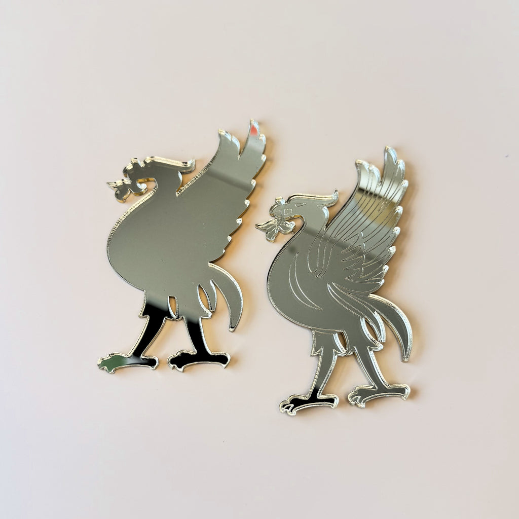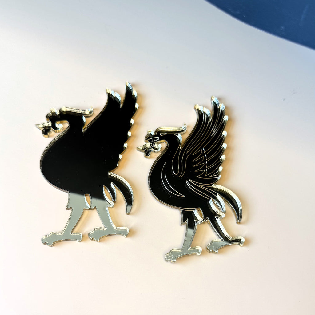 Add a unique and elegant touch to your celebration with this set of two Liver Bird cake charms made from gold mirrored acrylic. Featuring one engraved design and one plain silhouette, these striking toppers are perfect for Liverpool-themed weddings, parties, or special events.