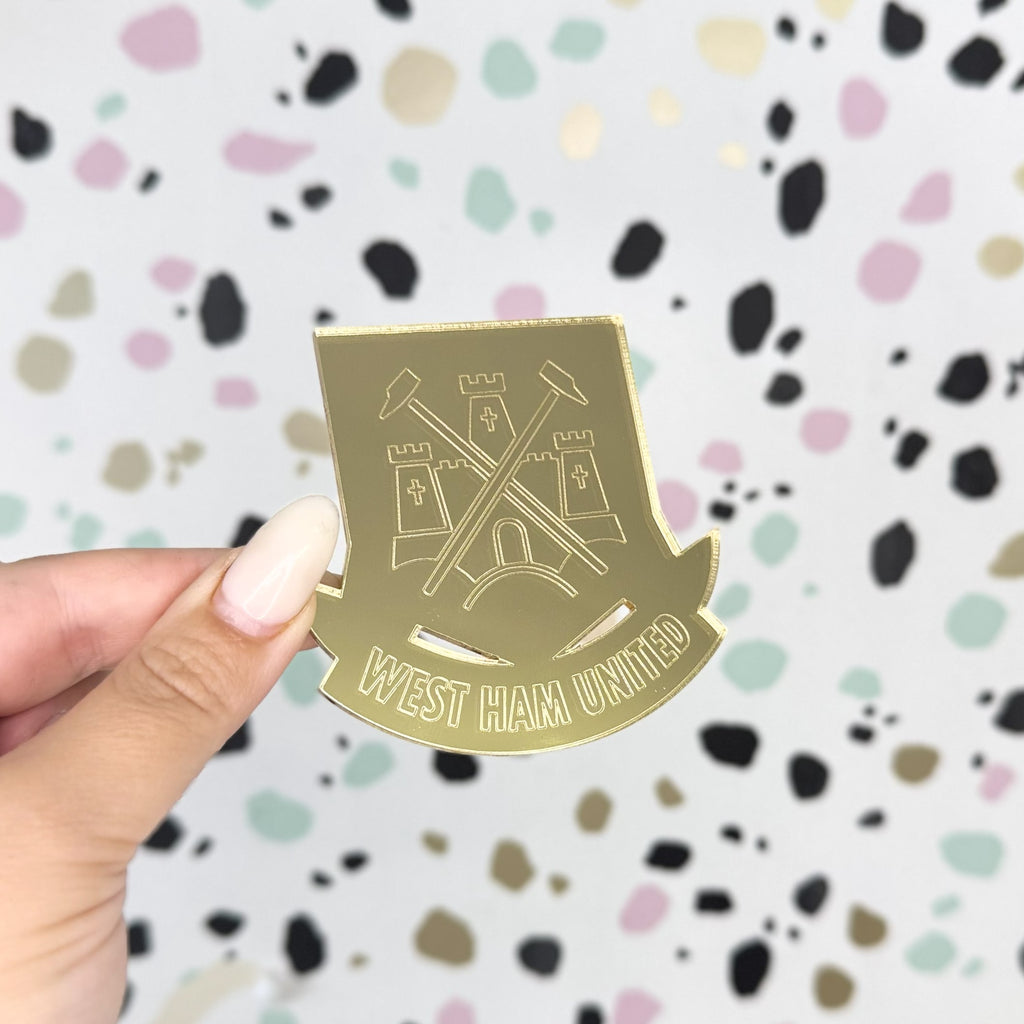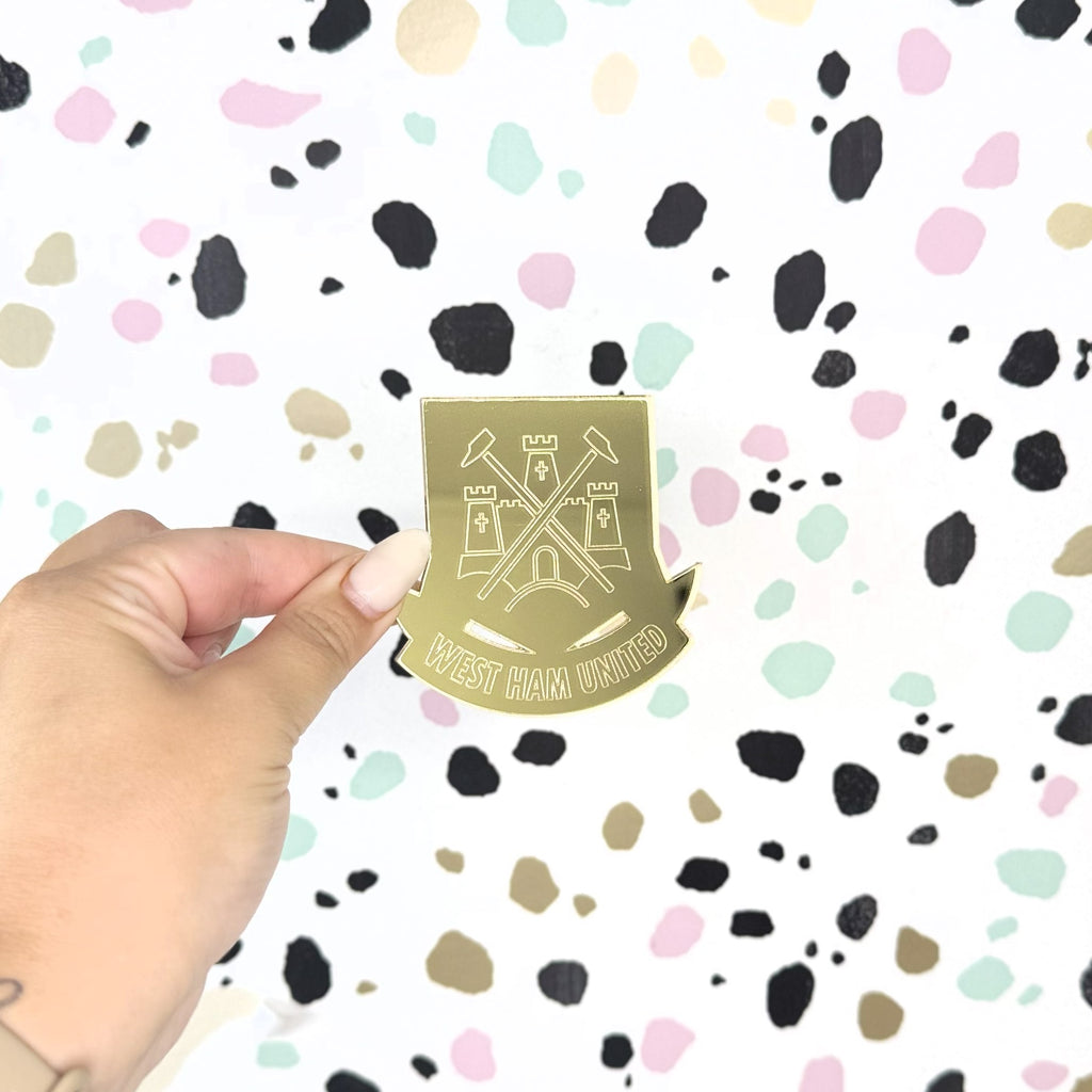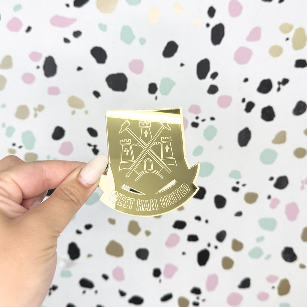 Cake Topper Charm, expertly crafted from stunning gold mirror acrylic. Featuring the iconic badge with detailed engraved outlines, this piece adds a sleek and stylish finish to any football fan’s cake or dessert setup.